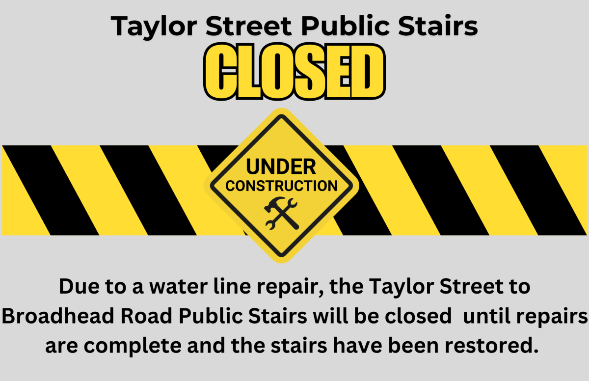 Due to a water line repair, the Taylor Street to Broadhead Road Public Stairs will be closed beginning today, October 18, 2024, through the remainder of the utility work.