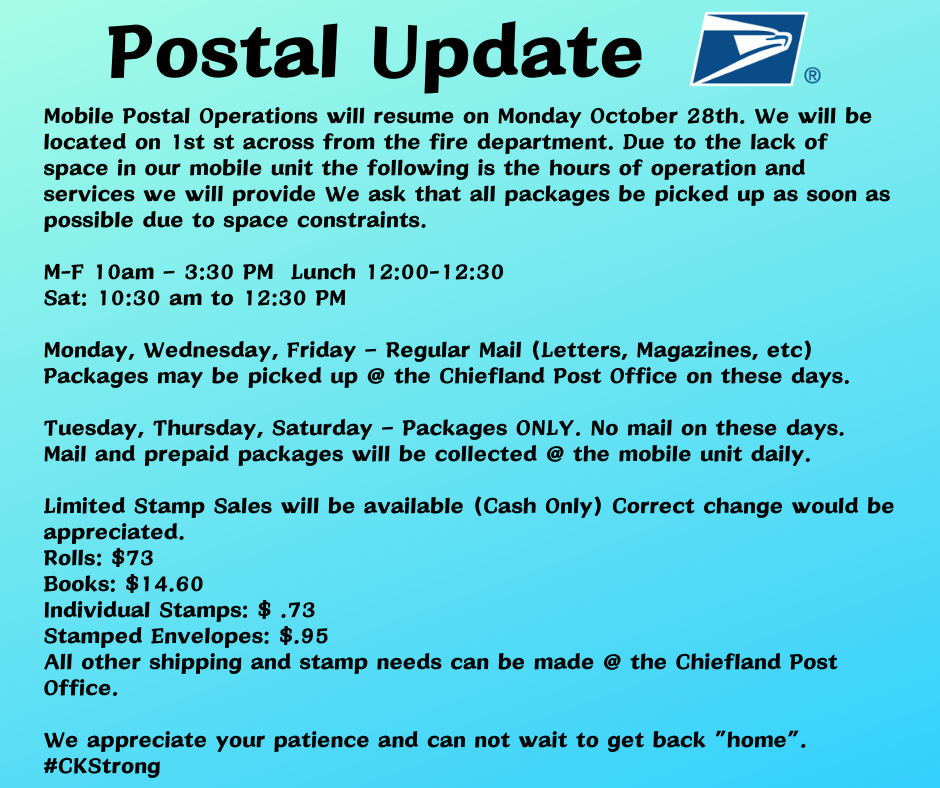 Mobile Postal Operations will resume on Monday October 28th. We will be located on 1st st across from the fire department. Due to the lack of space in our mobile unit the following is the hours of operation and services we will provide We ask that all packages be picked up as soon as possible due to space constraints.