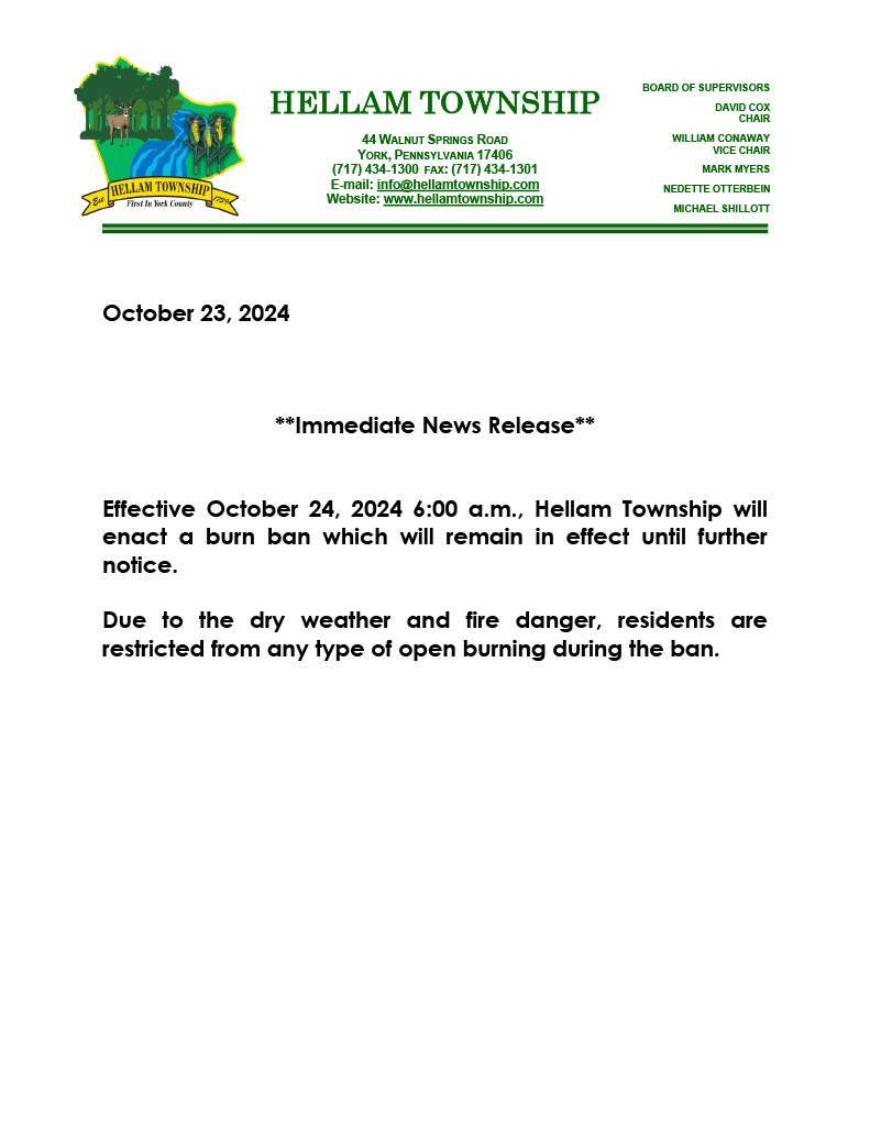 Effective October 24, 2024 6:00 a.m., Hellam Township has enacted a burn ban which will remain in effect until further notice. Due to the dry weather and fire danger, residents are restricted from any type of open burning during the ban.