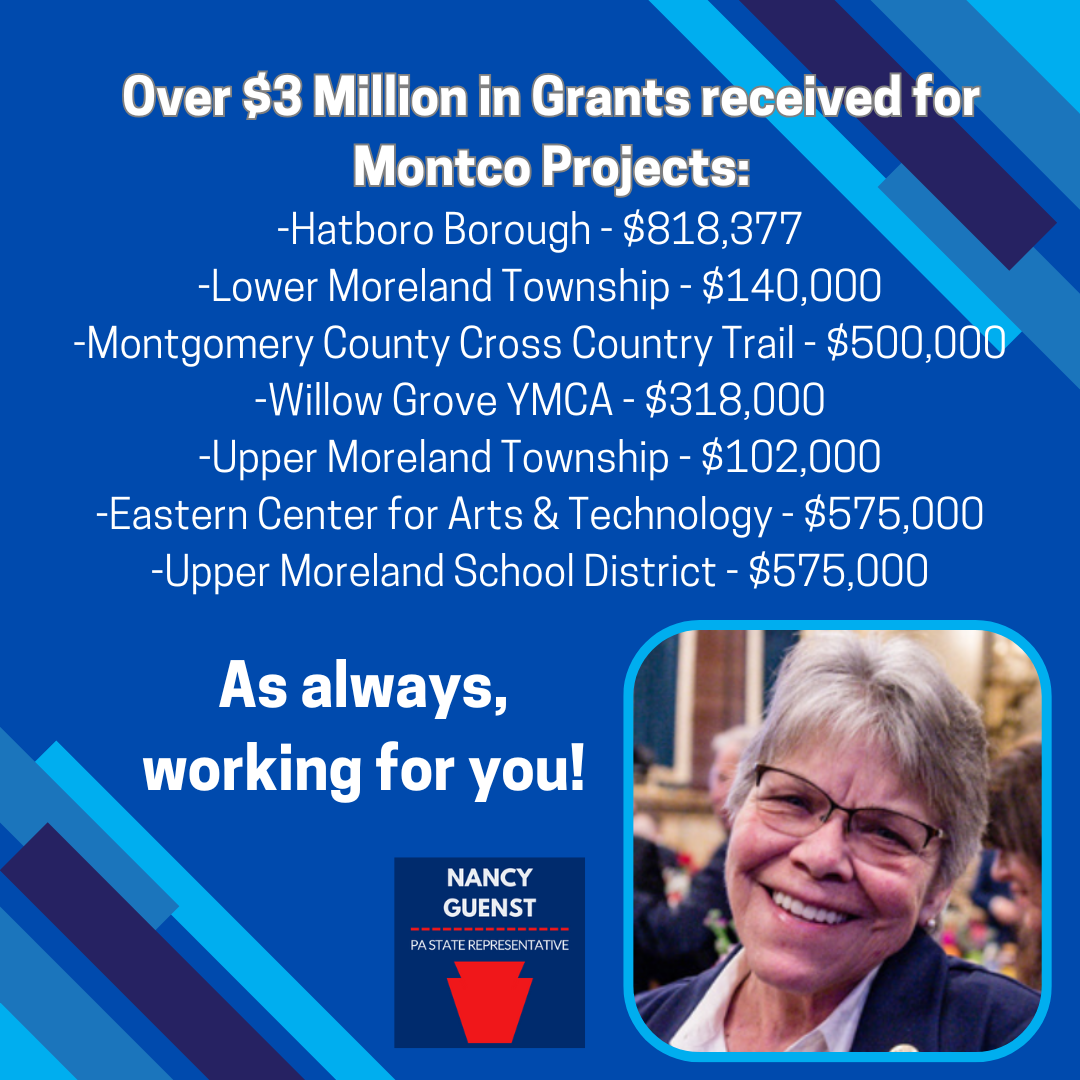 HATBORO, Oct. 23 – State Rep. Nancy Guenst, D-Montgomery, today announced that over $3 million in state funding has been awarded to several projects in her district. "These projects are all about enhancing the quality of life in our district," Guenst said. "Memorial Park will be more accessible for everyone. The Bethayres streetscape design will boost local business and pedestrian safety. The Cross County Trail expansion will connect our communities and provide a great space for recreation. The new pavilions at the Willow Grove YMCA willgive more children the chance to learn and grow. Plus, the upgrades at Eastern Center and Upper Moreland Primary School will ensure safer, more comfortable environments for our students and staff. I'm excited to see the positive changes these projects will bring."