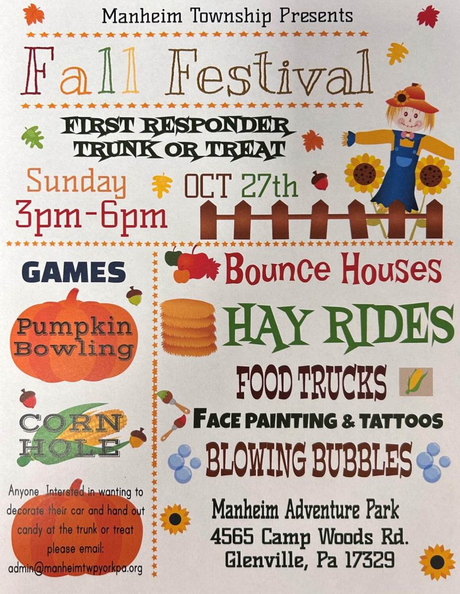 Don't miss out on our Fall Festival and Trunk or Treat today! Have some dinner at the Food To Go Truck, enjoy some yummy desserts from Messy Kitchen Cupcakes and Kona Ice, have some specialty coffee or hot cocoa to warm you up.There will be two bounce houses, 2 obstacle courses, double slide, along with tattoos, face painting, corn hole, pumpkin bowling and bubbles! Have fun trunk or treating with our first responders, visit with Northern York Regional Police officer and take a look at their police car along with Lineboro Firefighters and their fire trucks, Manheim Township big equipment will be out on display as well for all the trunk or treaters. Don't forget to take a hayride around Manheim Adventure Park! Sunday, October 27th from 3:00 pm - 6:00 pm
