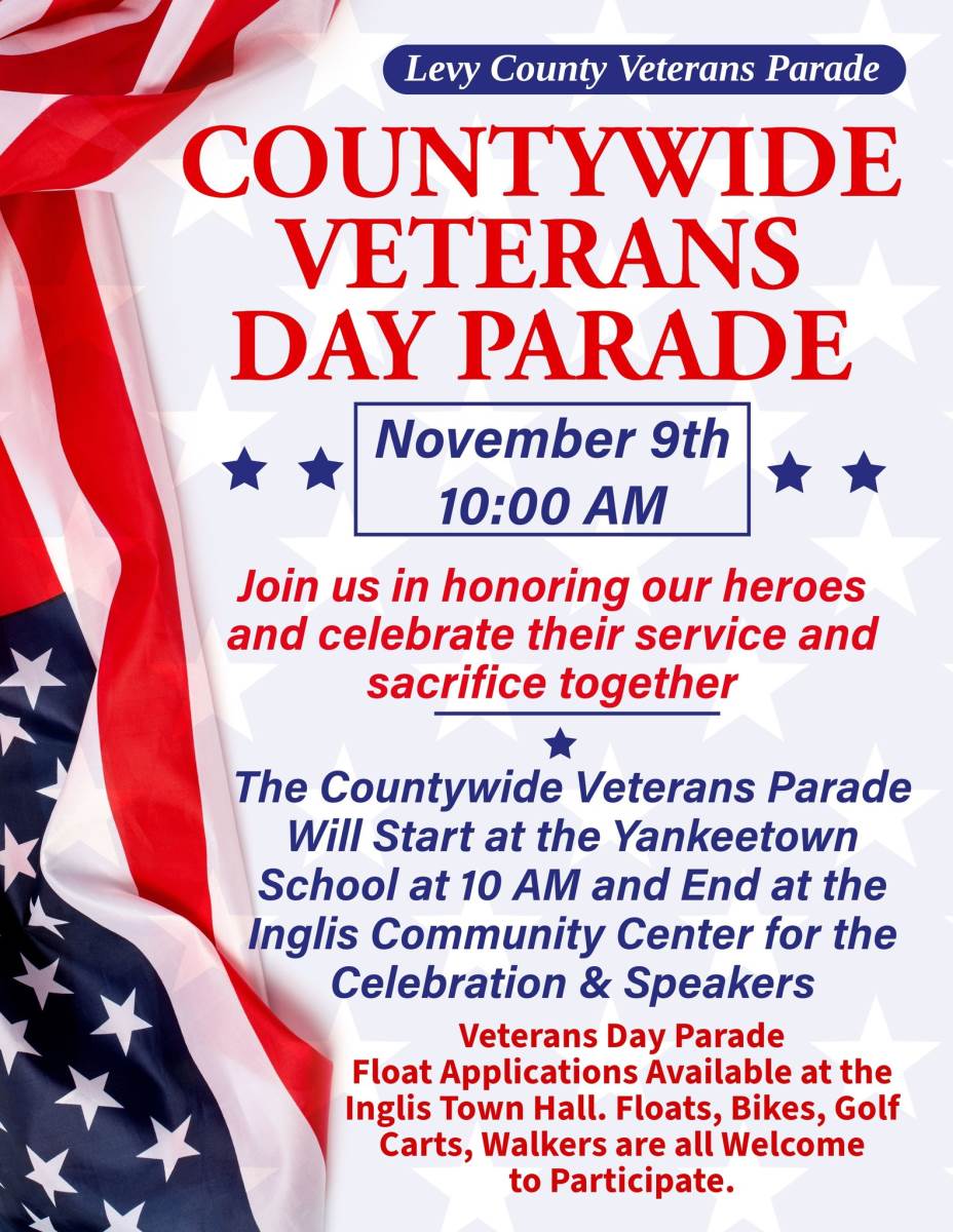 Veterans Day Parade Application Deadline has been extended to November 7th. If you would like to participate in the Parade, please pick from Inglis Town Hall.
