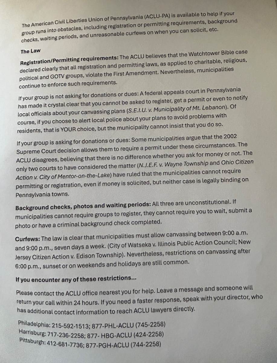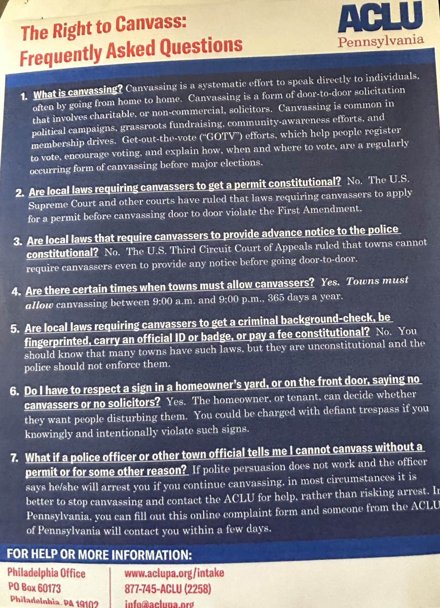 The Borough of Liberty is reaching out to provide clarification regarding recent observations of individuals discussing voting in our Borough. After consulting, with our Chief of Police, we have confirmed that these individuals do not require a permit for their activities. This type of outreach falls under canvassing, which is permitted from 9:00 am to 9:00 pm, year round.