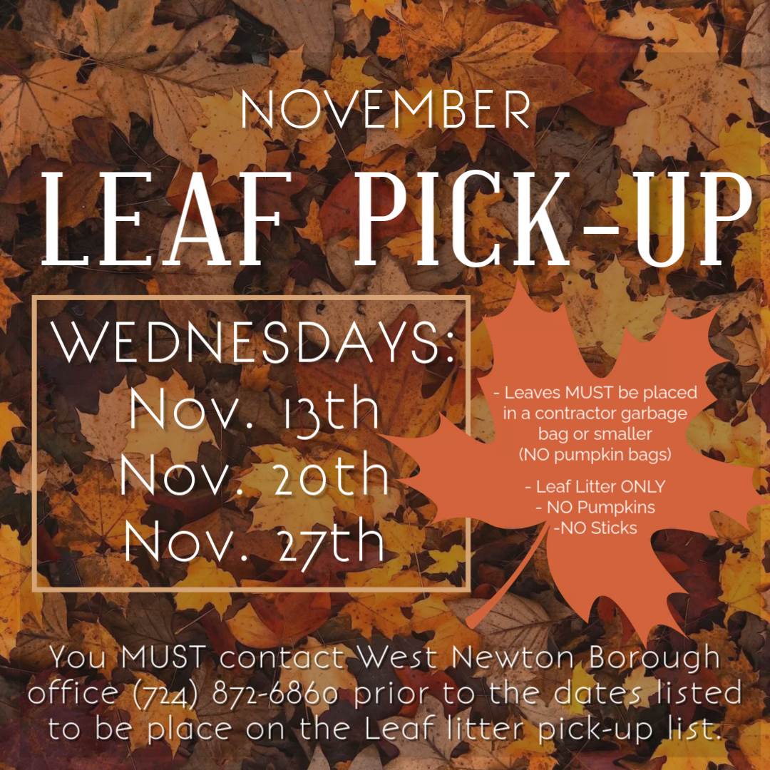 West Newton Borough will be doing a Leaf Pick-up the following 3 Wednesdays: