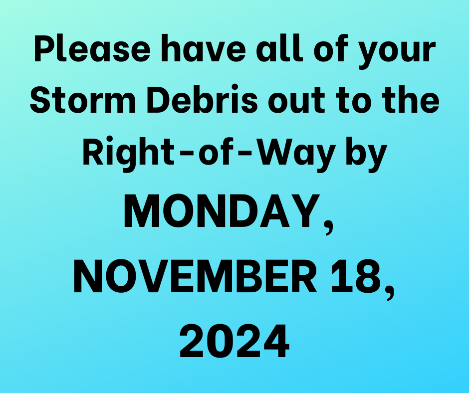 Please have all of your Storm Debris out to the Right-of-Way by MONDAY, NOVEMBER 18, 2024.