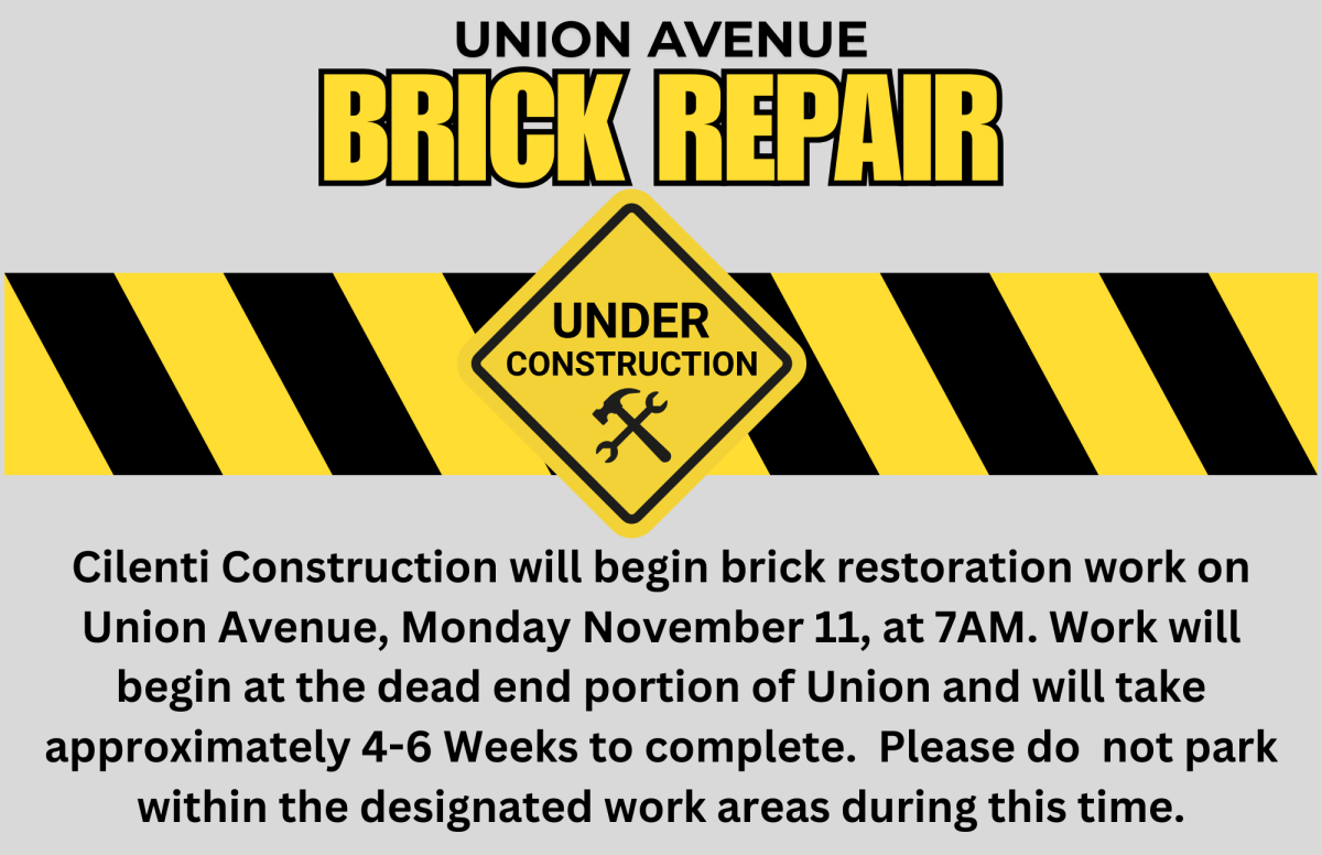 Cilenti Construction will be on Union Avenue, Monday, November 11th at 7 AM to begin restoring the brick road that was subject to a water main replacement over the summer. The work is to begin at the dead-end section of the road and is expected to take approximately 4-6 weeks to complete.