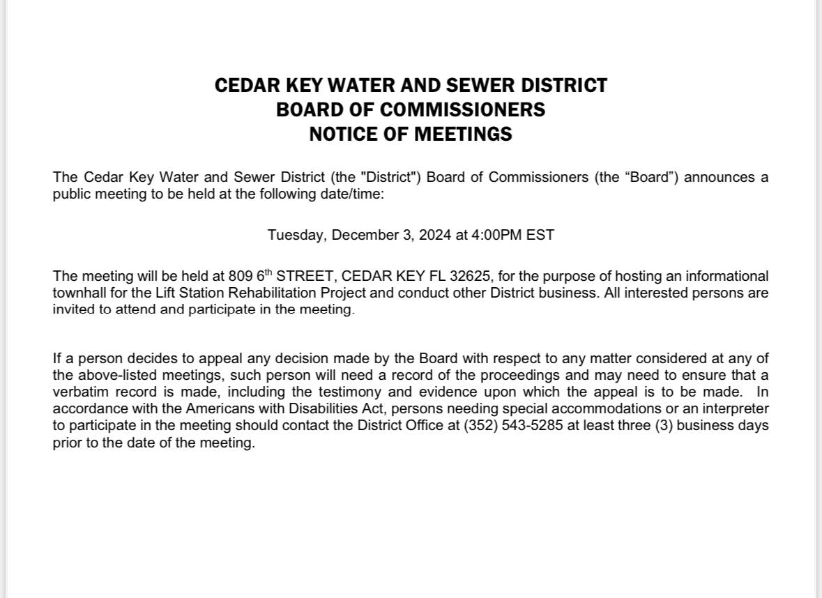 This notification was posted by City of Cedar Key. City of Cedar Key is solely responsible for this notification and unless specifically indicated, no other community or individual utilizing Savvy Citizen is sponsoring, responsible for, or endorsing this notification.