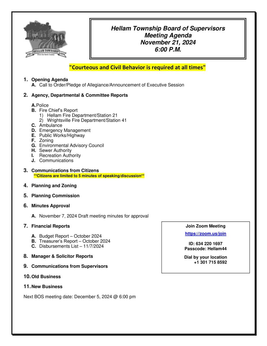 This notification was posted by Hellam Township. Hellam Township is solely responsible for this notification and unless specifically indicated, no other community or individual utilizing Savvy Citizen is sponsoring, responsible for, or endorsing this notification.