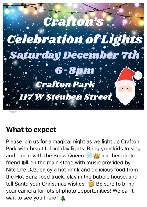 Join us at Crafton Park, off Steuben Street, on Saturday, December 7th, from 6:00-8:00PM for Crafton’s annual Celebration of Lights, rain or shine. This year’s event promises to be packed with family-friendly activities, guaranteed to get everyone into the holiday spirit.