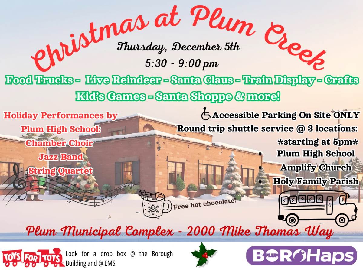 Join us Thursday, December 5, 2024, from 5:30-9PM at the Plum Municipal Complex for our annual Christmas at Plum Creek event!
