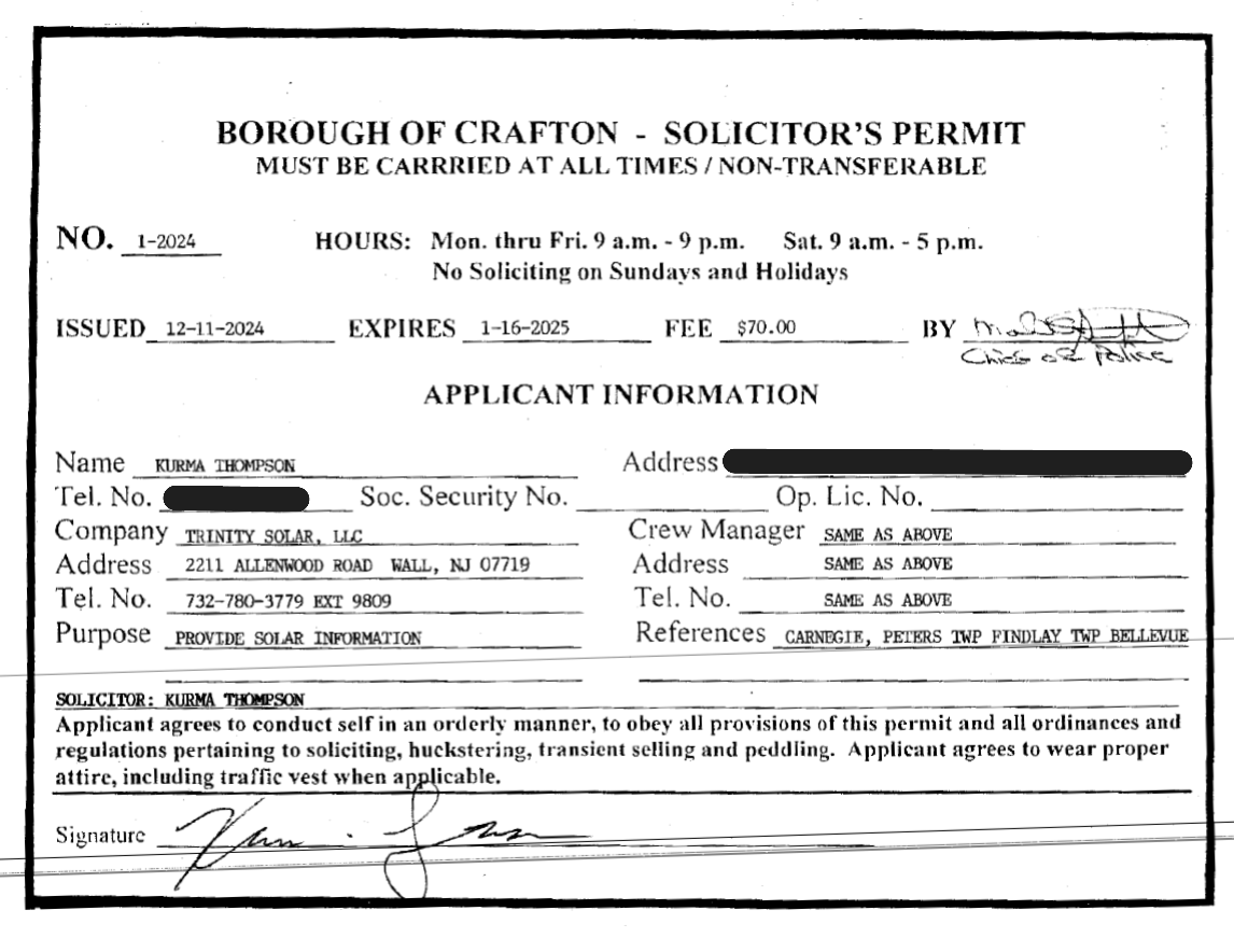 Anyone soliciting within the Borough of Crafton must have a solicitation permit to do so. Please contact the Crafton Police Department with concerns or questions regarding solicitation permits.