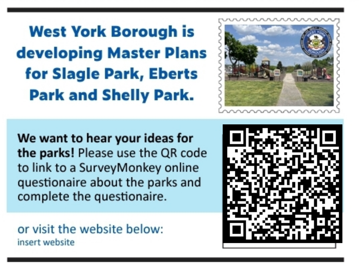 West York Borough has received a federal grant to produce a Park Master Plan. We are currently developing concepts for the master plan for each park, Slagle Park(on West Poplar Street), Eberts Park(on West Poplar Terrace), and Shelly Park(on Highland Ave). The Borough would like your anonymous input about the parks and their future enhancements. The results of the survey will help guide our process..Please click the link below or scan the QR code(in the comments)to complete the survey. Your participation is appreciated!