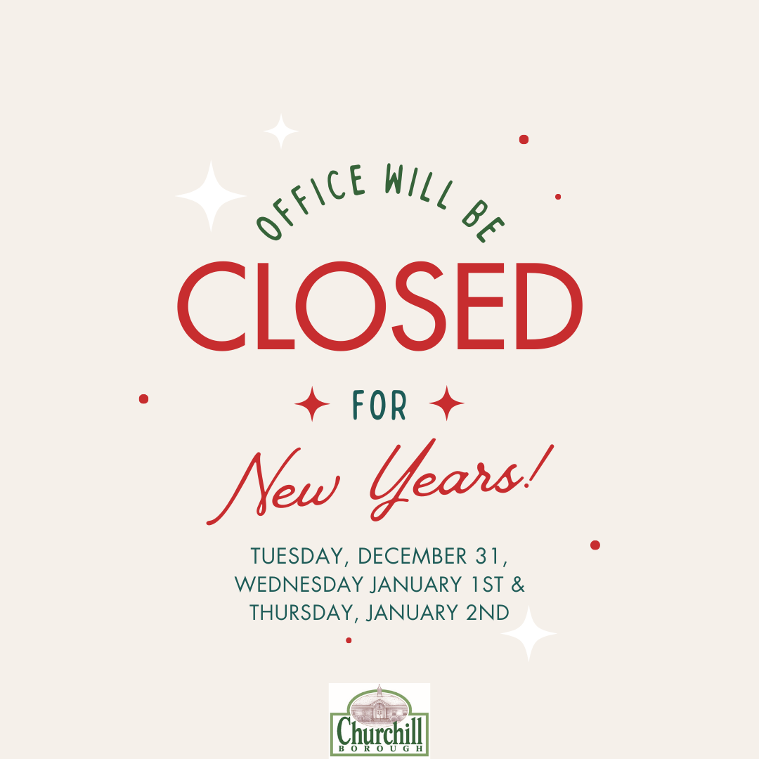 The borough office will be closed on Tuesday, December 31st, Wednesday, January 1st, and Thursday, January 2nd. We will re-open on Friday, January 3rd.