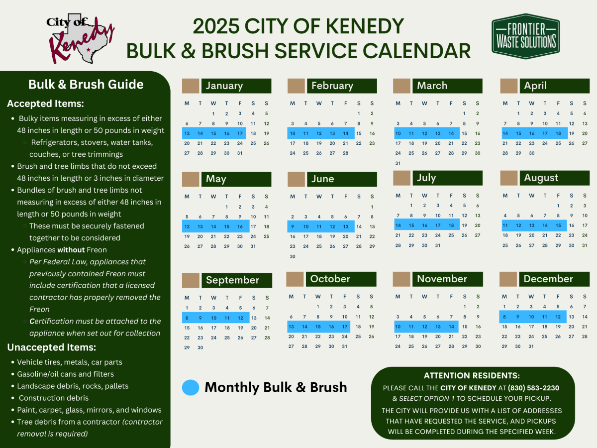 Listed below is important updated information regarding our City of Kenedy Bulk & Brush Pickup Service effective January 1, 2025.