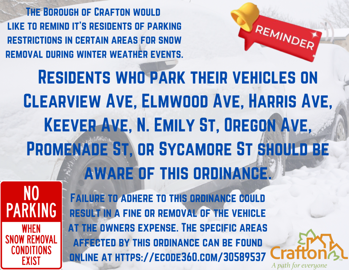 The Borough of Crafton would like to remind it's residents of parking restrictions in certain areas for snow removal during Winter Weather Events. Please see the list below, which outlines these specific streets and areas that are restricted during snow removal.