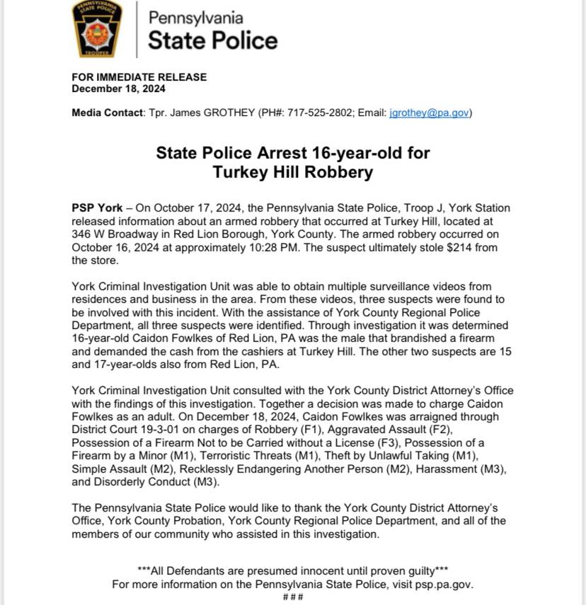 On January 12, 2025, the Pennsylvania State Police, Troop J, York Station was notified of an armed robbery that occurred at the Turkey Hill located at 346 W Broadway, Red Lion Borough, York County. Investigation by York Patrol and Criminal Investigation Units determined at 5:59 PM a white male entered the store demanding money and a pack of cigarettes while brandishing a handgun. The male was wearing a black sweatshirt, black jeans, and a white mask. After obtaining money and a pack of cigarettes, the male fled the scene to the rear of the store. The Pennsylvania State Police are asking people who live in the area to check their video surveillance systems for any signs of the described male. Anyone with information regarding this incident is asked to contact PSP York Station at 717-428-1011.