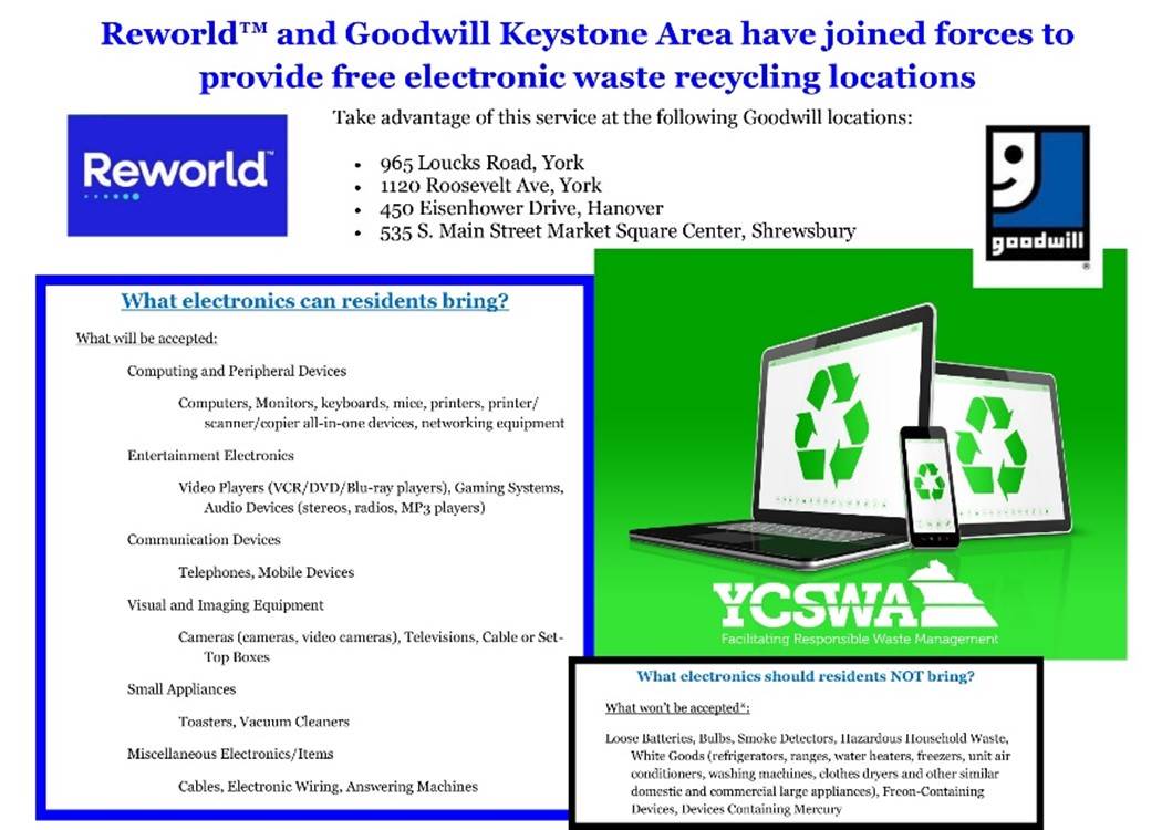Reworld™ and Goodwill Keystone Area have joined forces to provide free electronic waste recycling locations in central and southeastern Pennsylvania. This program utilizes Goodwill’s network of stores and donation centers as designated collection points for consumer electronics. Reworld™ then takes the electronics and responsibly recycles them. Reworld™ is a proven provider of e-waste recycling, recovery and environmentally responsible disposal, having recycled more than 135 million pounds of e-waste. Take advantage of this service at the following Goodwill locations: