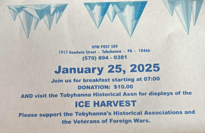 The Tobyhanna Ice Harvest is scheduled for this Saturday, January 25, 2025 from 9am-2pm and will be held at 2071 Lakeside Drive, Tobyhanna, PA 18466. Please visit their Facebook page: Tobyhanna Ice Harvest for more information or call 570.894.8205.