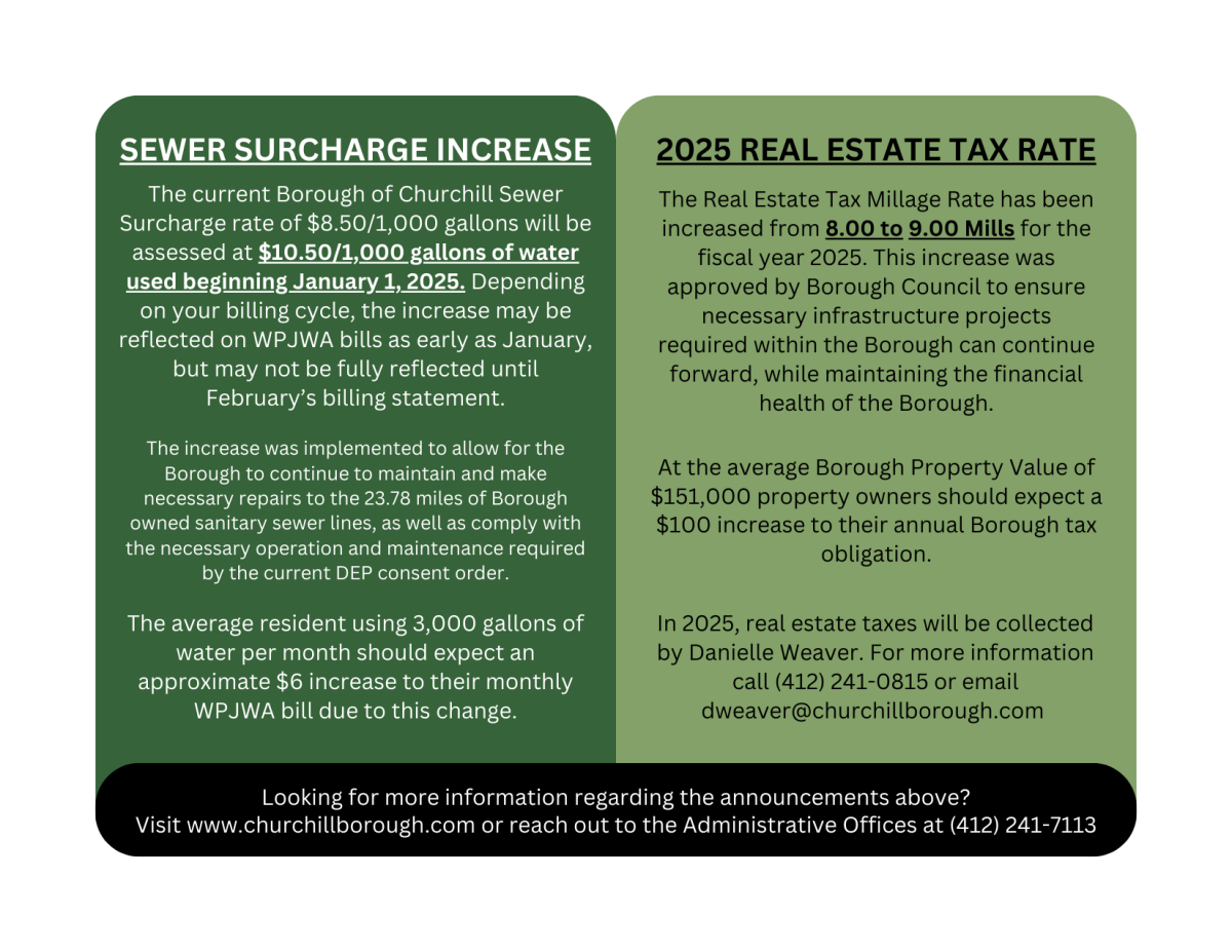 A postcard was sent out stating that the 2025 Churchill Borough Sewer Rate increase would be about $31.50/month—this information was misworded. The actual increase is only $6.00/month.