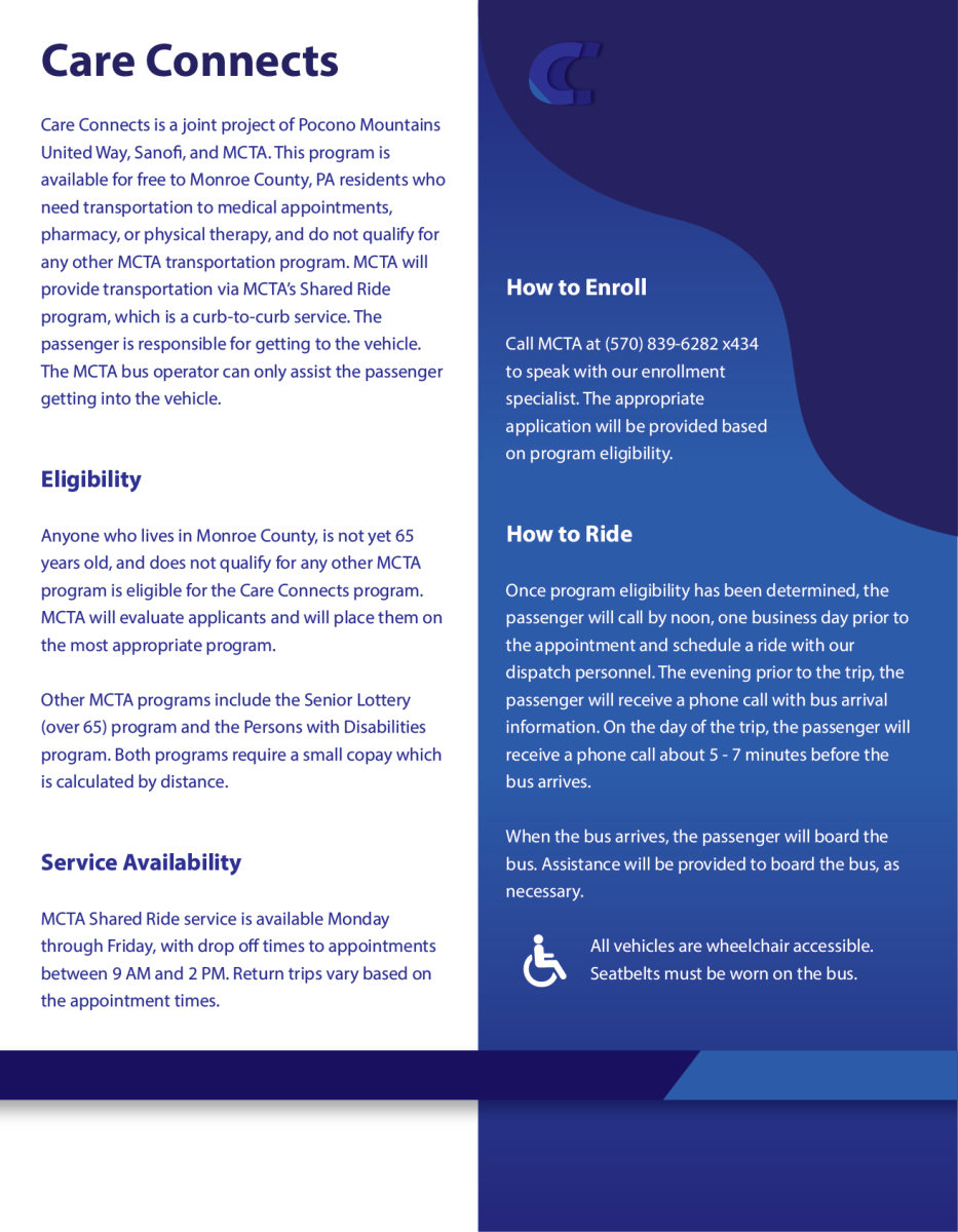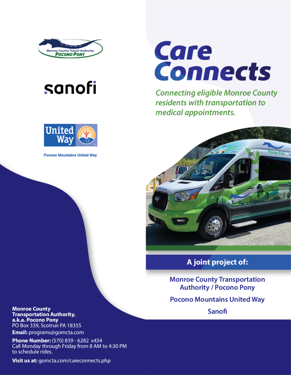 Care Connects is a partnership between MCTA and Pocono Mountains United Way and provides transportation to medical appointments and pharmacy visits for individuals who do not qualify for other MCTA transportation programs. There are no income or age restrictions, so it is an excellent opportunity to assist individuals who are just getting by and don’t qualify for other transportation assistance. This program is good for trips that begin and end in Monroe County only and was made possible by funding from Sanofi.