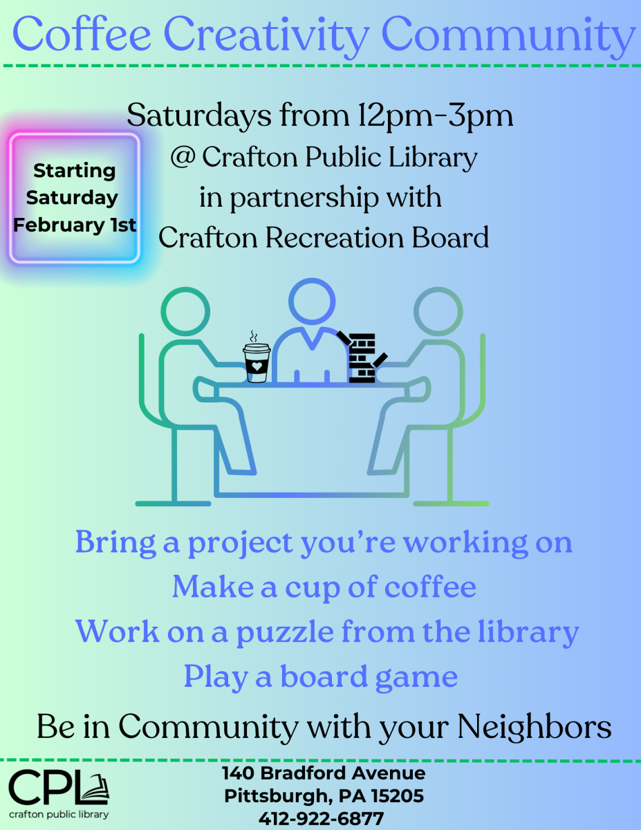 The Crafton Public Library, in partnership with the Crafton Recreation Board, invites you to join them on Saturdays, from 12PM to 3PM for Coffee, Creativity & Community.