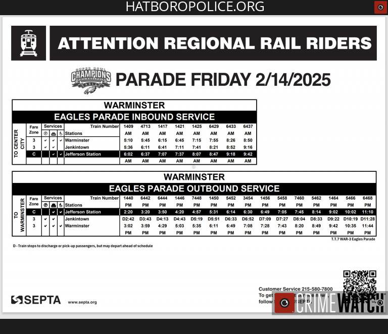 SEPTA regional rail service will be operating on a modified schedule this Friday, February 14, 2025 for the Eagles Super Bowl Parade. In order to streamline the flow of passengers to and from Philadelphia, only select stations will be open to board and depart trains.