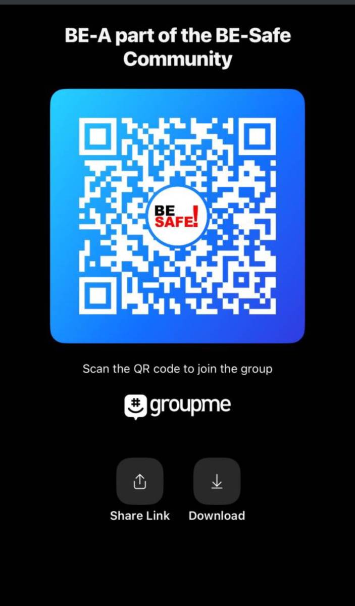 You're invited to the group 'BE-A part of the BE-Safe Community' on GroupMe. Click here to join:https://groupme.com/join_group/94515830/iGpXjBje