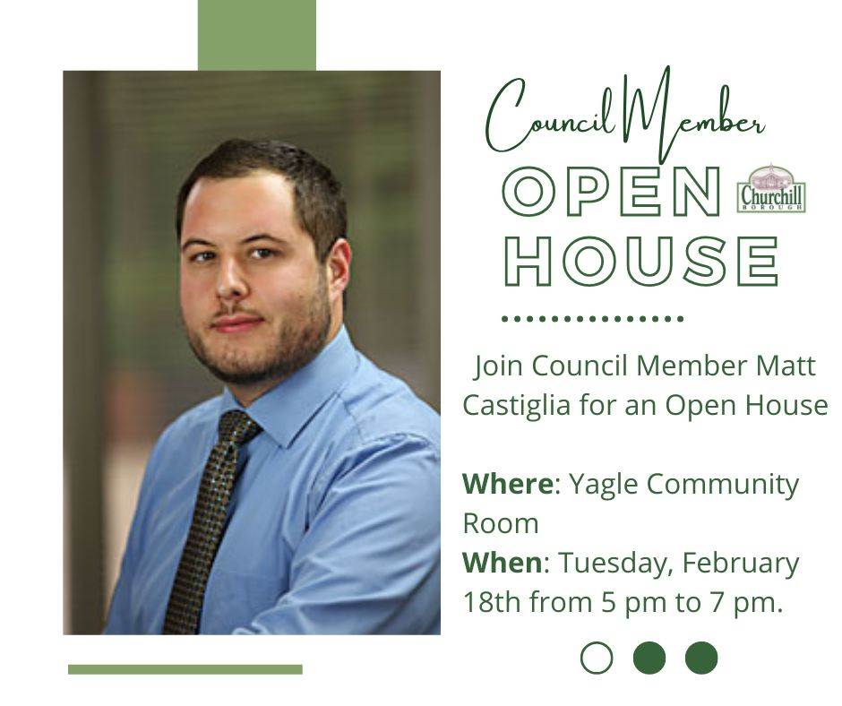 Council Member Matt Castiglia will have an Open House tonight from 5 pm - 7 pm in the Yagle Community Room at the Borough Building. Make sure you stop by and say hi!