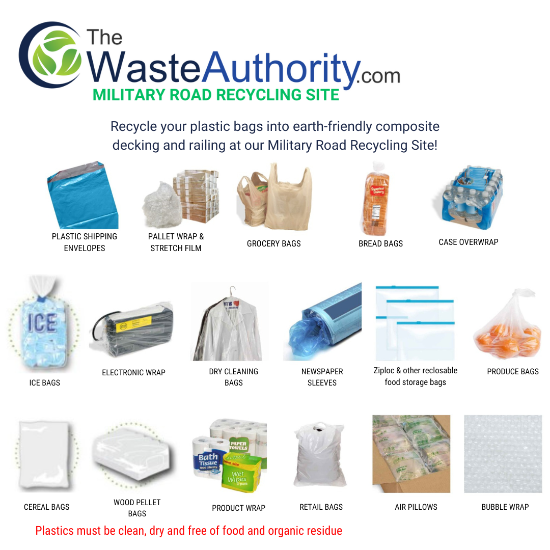 Recycle your plastic bags into earth-friendly composite decking and railing at the Military Road Recycling Site!