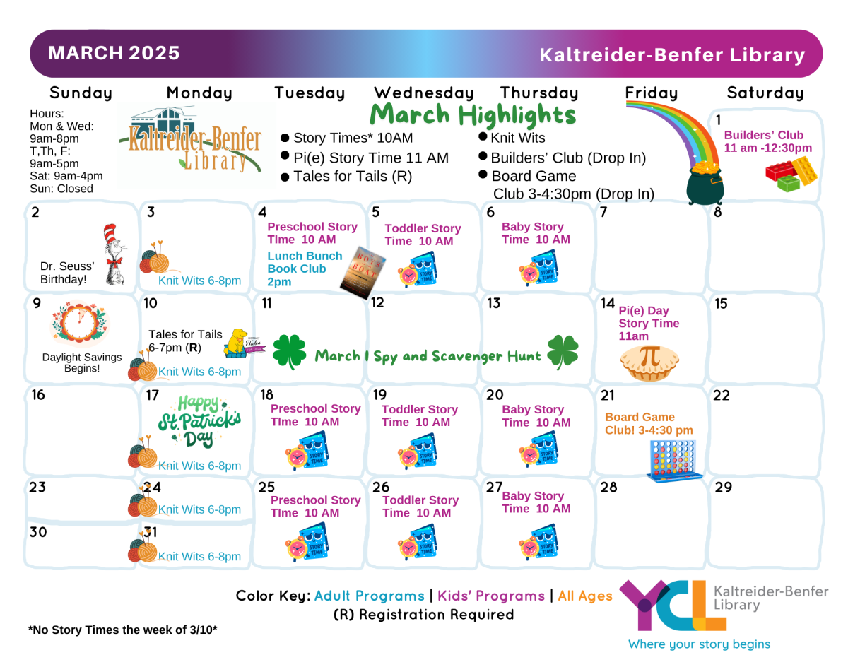 Attached are the March monthly events for Kaltreider Benfer Library. Everyone is invited to attend and participate in what the library has to offer.