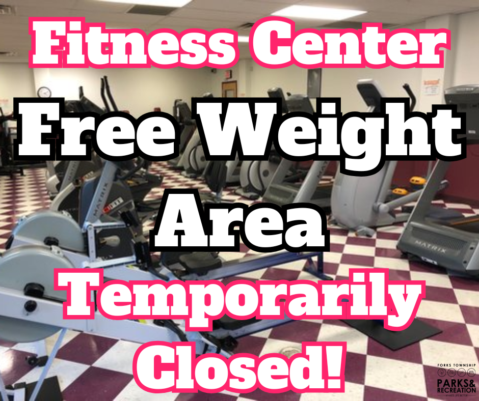 The Fitness Center located in the Forks Township Community Center is Open. However, the Free Weight Area of the Fitness Center is temporarily closed due to floor maintenance. We anticipate the Free Weight Area to re-open late afternoon tomorrow, March 6.