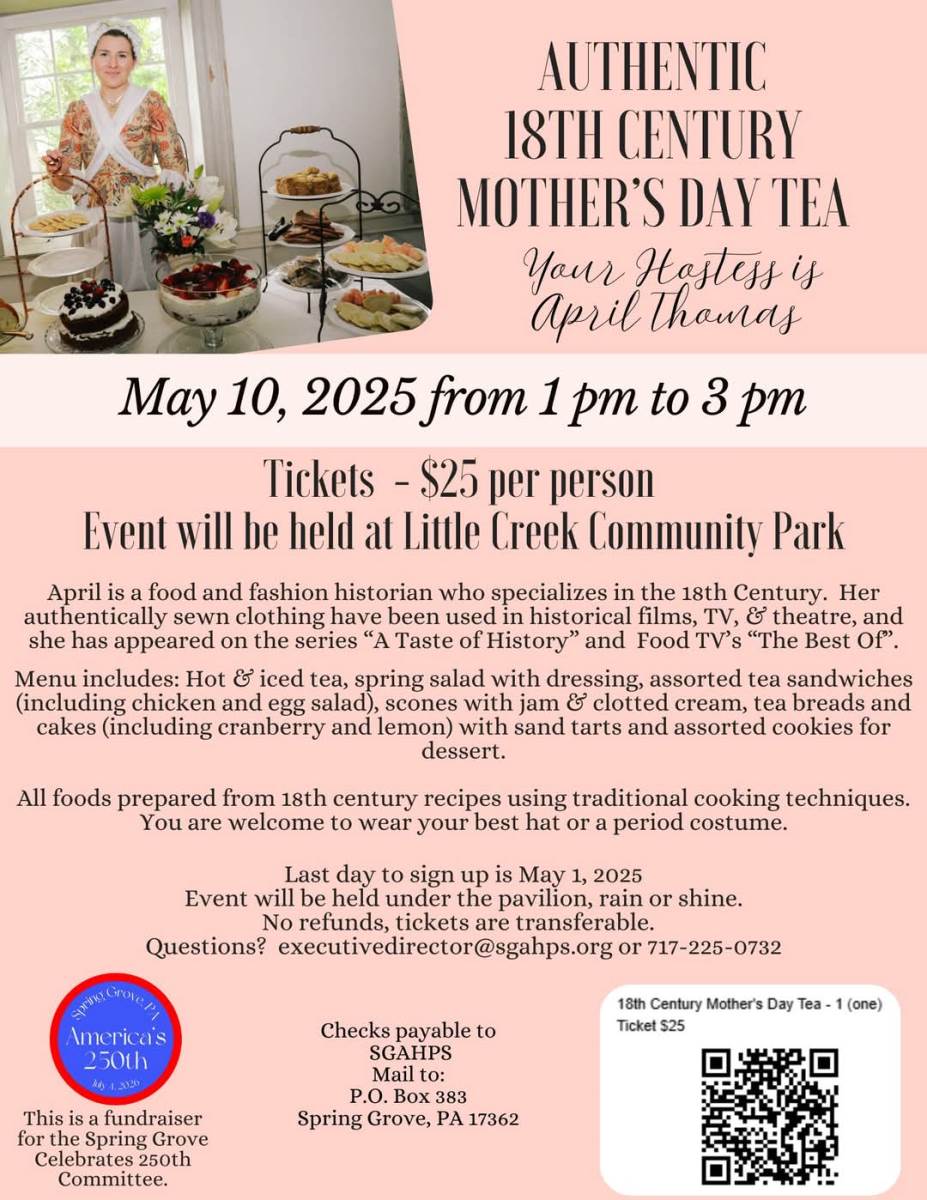 Spring Grove Area Historical Preservation Society will be hosting an Authentic 18th Century Mother's Day Tea on May 10, 2025, from 1pm to 3pm at Little Creek Community Park.