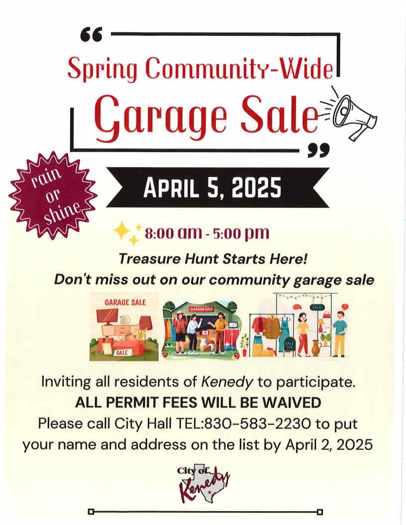 Let's get our SPRING CLEANING underway and plan for a garage sale!!! Join our City of Kenedy Community Garage Sale on