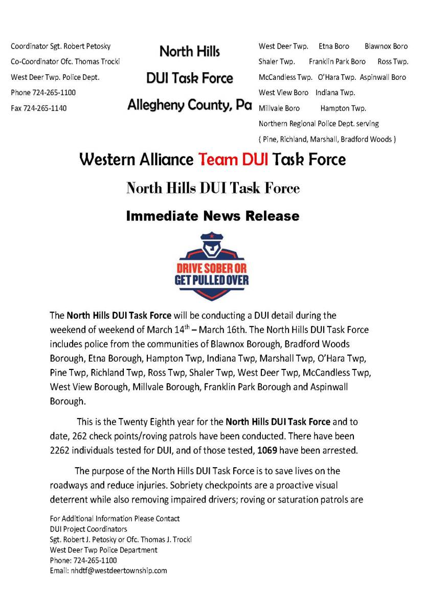 The North Hills DUI Task Force will be conducting a DUI detail during the weekend of weekend of March 14th – March 16th. The North Hills DUI Task Force includes police from the communities of Blawnox Borough, Bradford Woods Borough, Etna Borough, Hampton Twp, Indiana Twp, Marshall Twp, O’Hara Twp, Pine Twp, Richland Twp, Ross Twp, Shaler Twp, West Deer Twp, McCandless Twp, West View Borough, Millvale Borough, Franklin Park Borough and Aspinwall Borough.