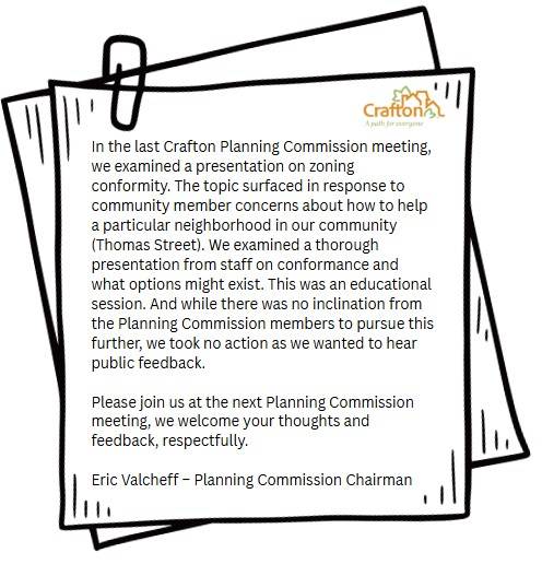In the last Crafton Planning Commission meeting, we examined a presentation on zoning conformity. The topic surfaced in response to community member concerns about how to help a particular neighborhood in our community (Thomas Street). We examined a thorough presentation from staff on conformance and what options might exist. This was an educational session. And while there was no inclination from the Planning Commission members to pursue this further, we took no action as we wanted to hear public feedback.