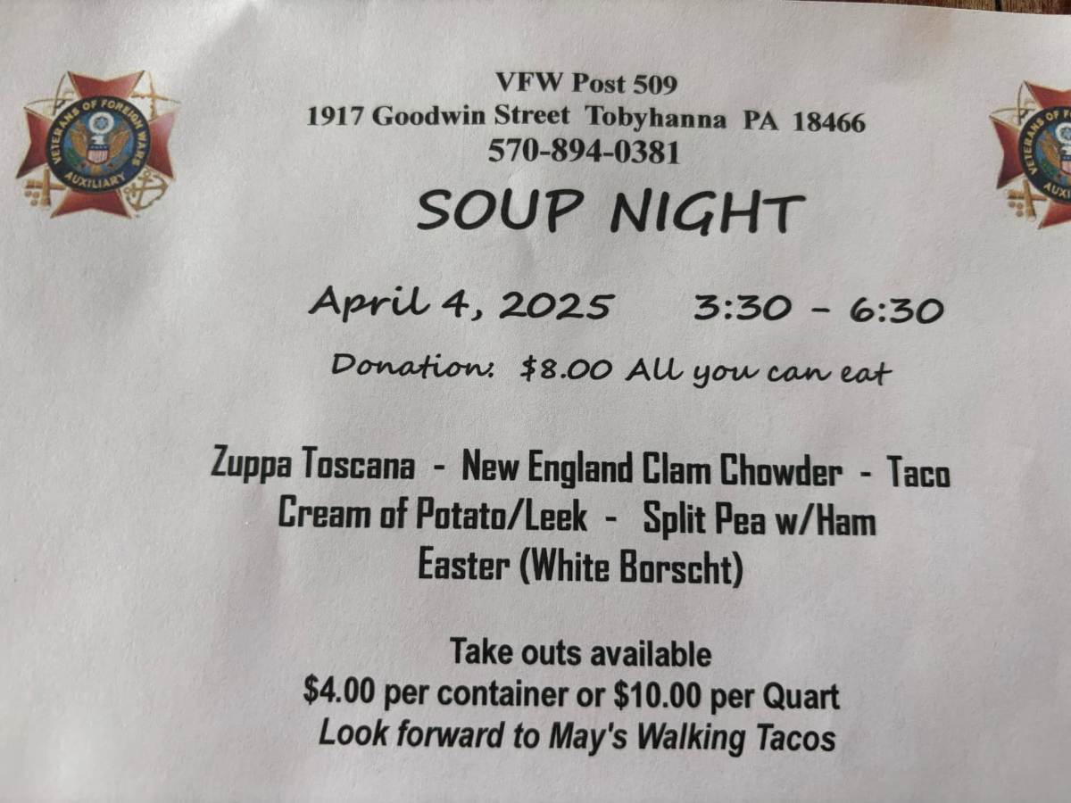 VFW Post 509 will be hosting a Soup Night on Friday, April 4, 2025 from 3:30 to 6:30pm at the Post located at 1917 Goodwin Street, Tobyhanna. Soups on the menu are: Zuppa Toscana, New England Clam Chowder, Taco, Cream of Potato/Leek, Split Pea w/ Ham and Easter (White Borscht). All you can eat for a donation of $8.00 per person; Take out is available for $4.00 per container or $10.00 per quart. Please see the attached flyer and direct all questions, directly to the post.