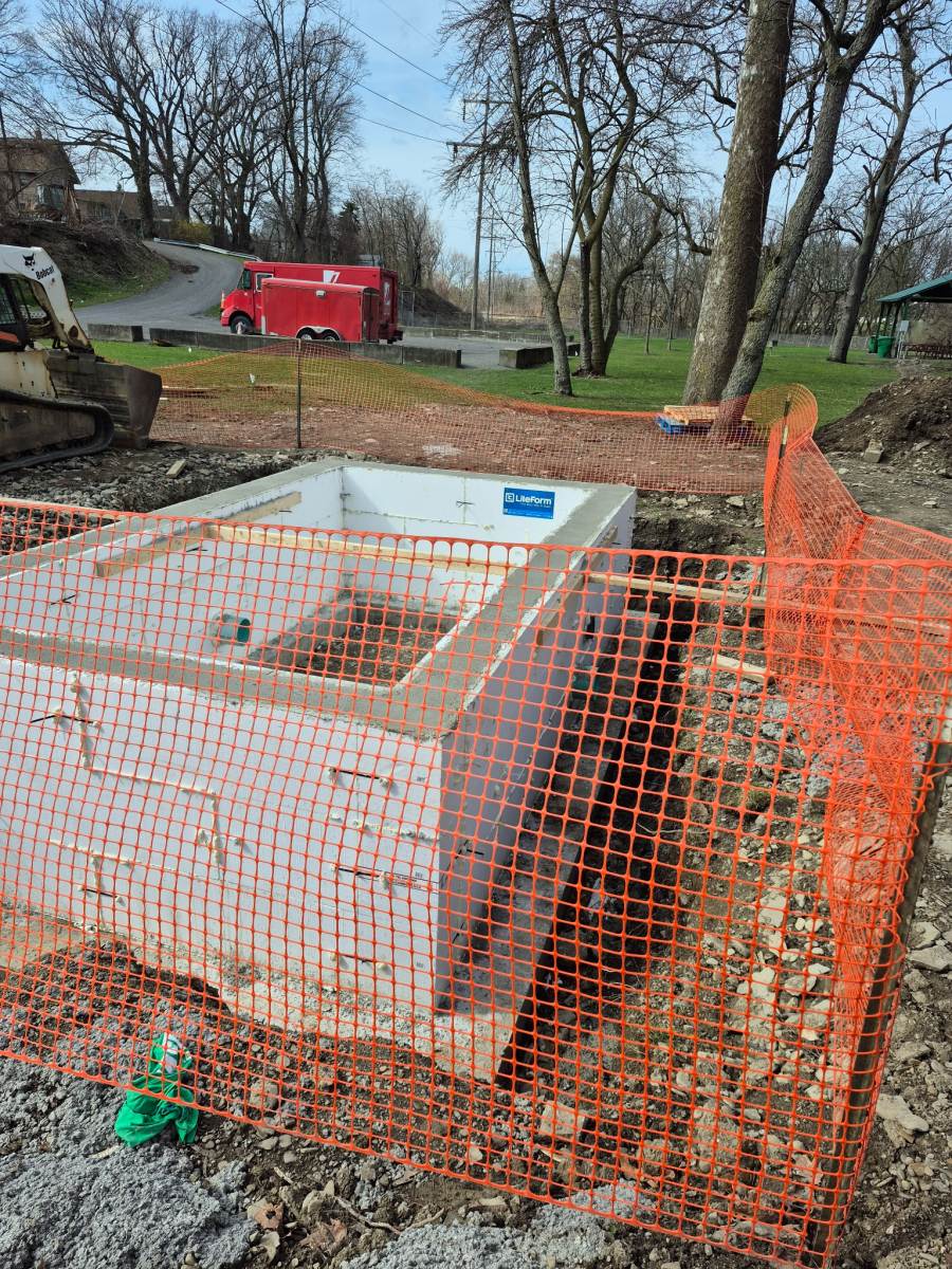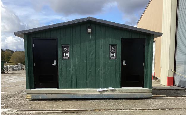 Work is currently underway at Hinkler Park to install utilities and prepare the foundation for the addition of permanent restrooms. The restroom unit, pictured here, has been completed and will be delivered and craned into place on the foundation in the coming weeks. Additionally, the old, deteriorated bathroom building at the top of the hill near the exit ramp has been removed. This building had been out of service for some time and was both inaccessible and inconvenient for park users.
