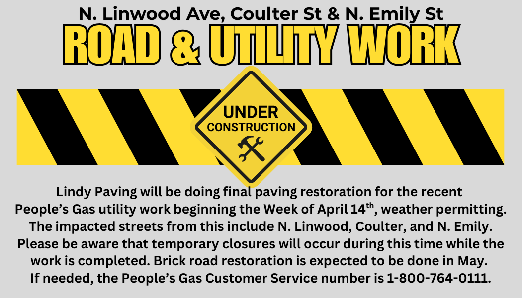 Weather permitting, Lindy Paving will be doing final paving restoration for the recent People’s Gas utility work beginning the Week of April 14th. The impacted streets from this include N. Linwood, Coulter, and N. Emily.