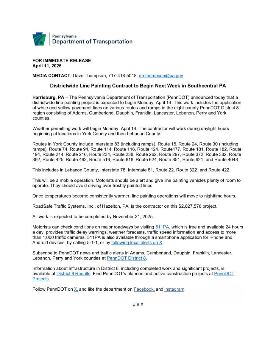 The Pennsylvania Department of Transportation (PennDOT) announced today that a districtwide line painting project is expected to begin Monday, April 14. This work includes the application of white and yellow pavement lines on various routes and ramps in the eight-county PennDOT District 8 region consisting of Adams, Cumberland, Dauphin, Franklin, Lancaster, Lebanon, Perry and York counties.