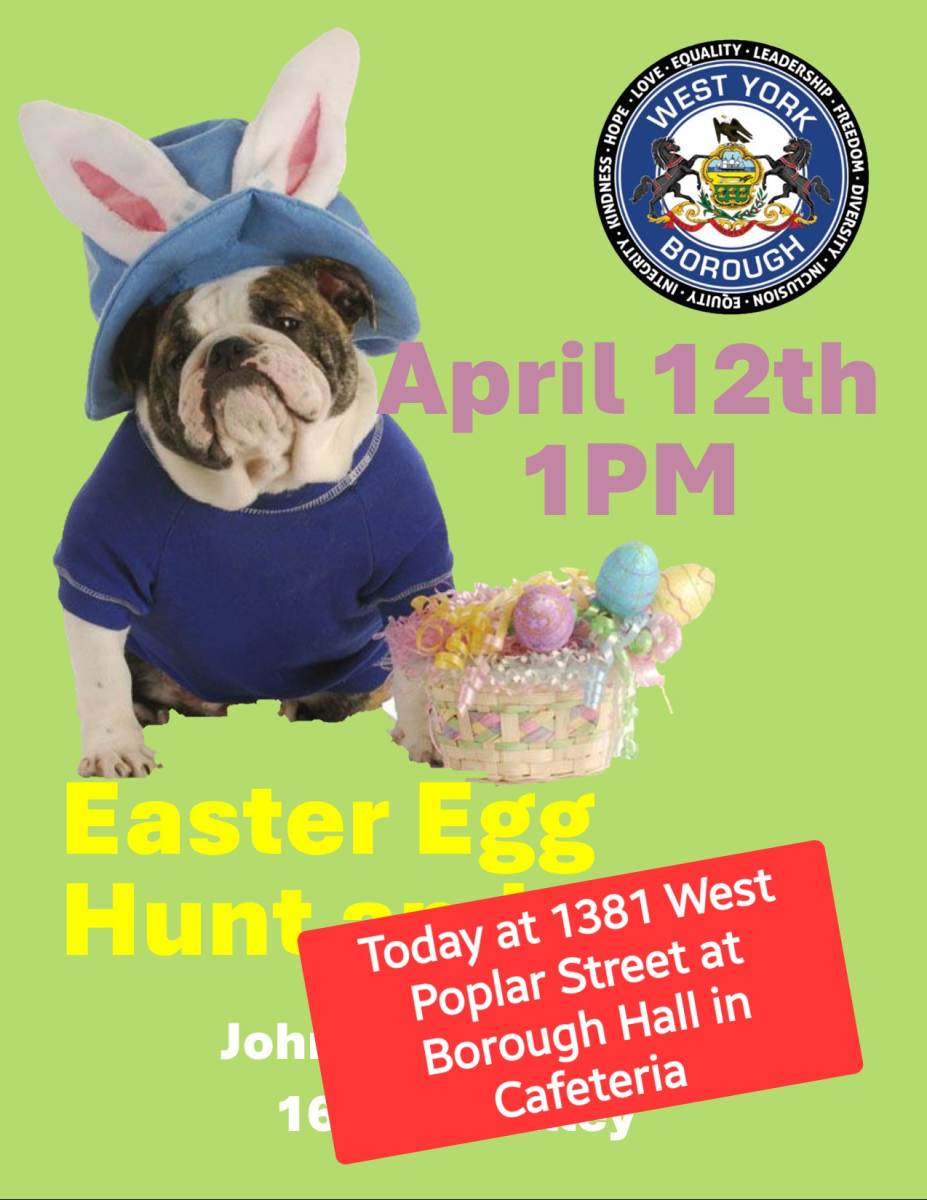 Due to rain and weather, the easter egg hunt will be held at Borough Hall at 1381 West Poplar Street at. 1PM