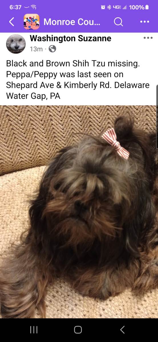 Black and Brown Shih Tzu missing since yesterday 04.11.25. Peppa/Peppy was last seen on Shepard Ave and Kimberly Road in Delaware Water Gap, PA on Saturday 04.12.25.