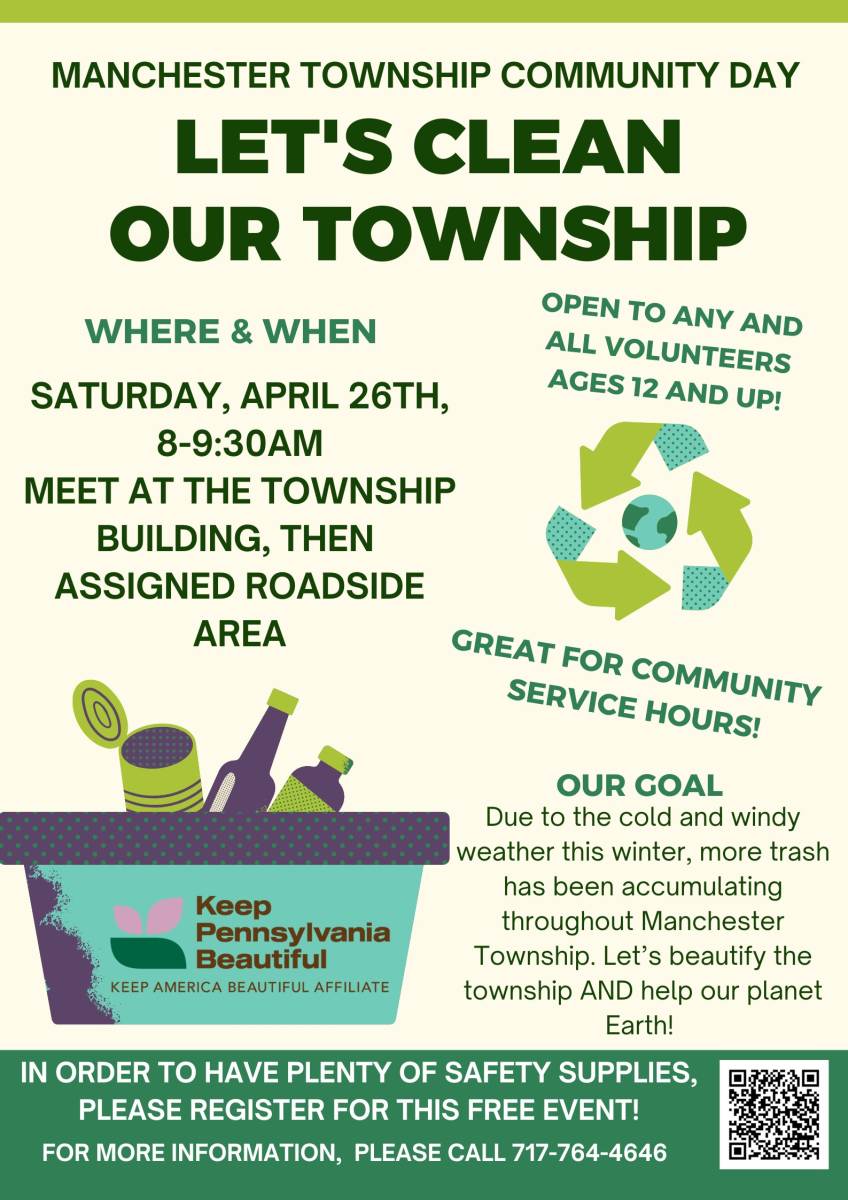 Manchester Township is hosting a community clean up day on Saturday, April 26th from 8:00 am - 9:30 am. We will meet at the township building on 3200 Farmtrail Road to gather supplies, review safety procedures, and obtain assigned areas for clean up.