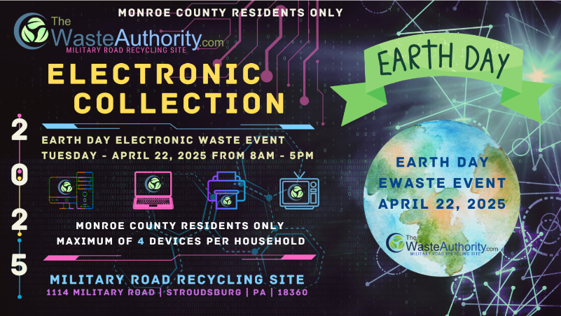 The Monroe County Waste Authority is holding an Ewaste Collection event on Earth Day, Tuesday, April 22, 2025 from 8:00 a.m. to 5:00 p.m.