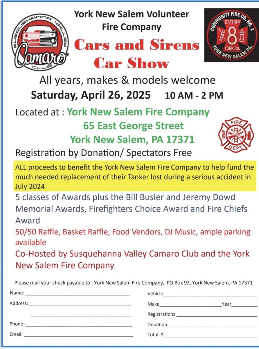 Friends and family of York New Salem community! Hope everyone is doing great today! The Fire Company's Car Show is coming up fast! Make sure you register ahead or you can register the day of the show. See you there!