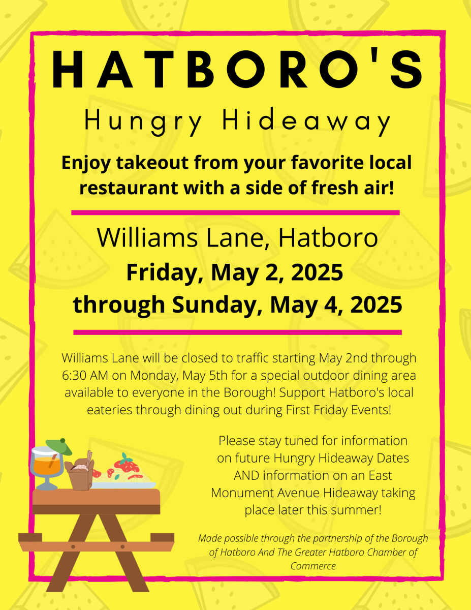 As noted above, the Borough of Hatboro will be opening the Hungry Hideaway outdoor dining area for each First Friday event of 2025. Throughout the summer, this dining area will rotate between Williams Lane and East Monument Avenue to provide outdoor dining areas near businesses on both sides of our main street district. The Borough is currently working on a schedule for the remainder of the summer. We will release information on the remaining dates and information on the new East Monument dining area in the coming weeks.
