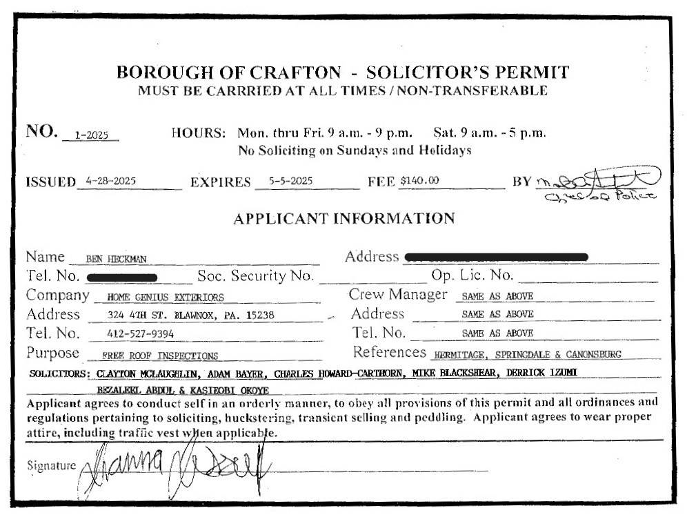 Crafton Police Department has issued the following Solicitation Permit.