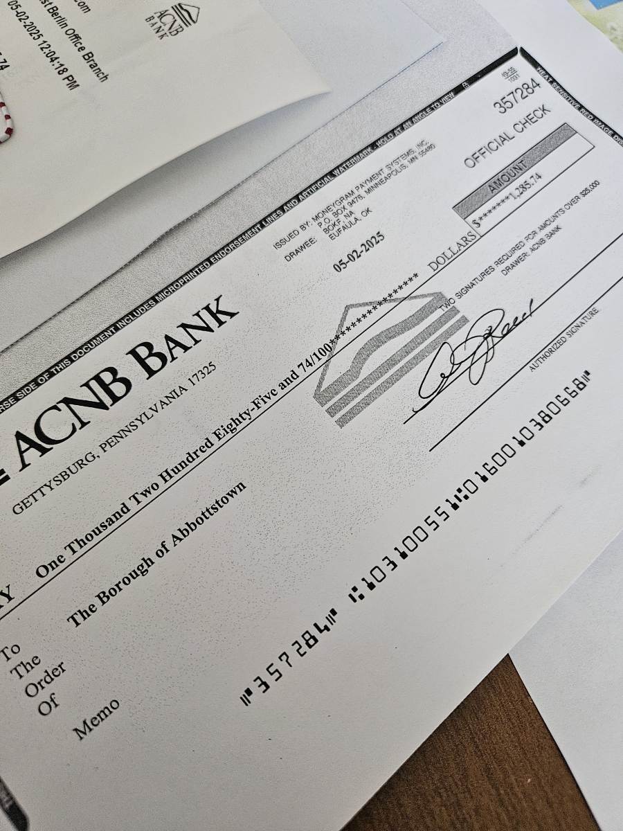 Over the years, Sandy has been safeguarding funds collected to start having Community Picnics at the Abbottstown Park. Now that we are improving the Park, Sandy has donated the nearly $1,300 collected to the Borough to move forward with these events.
