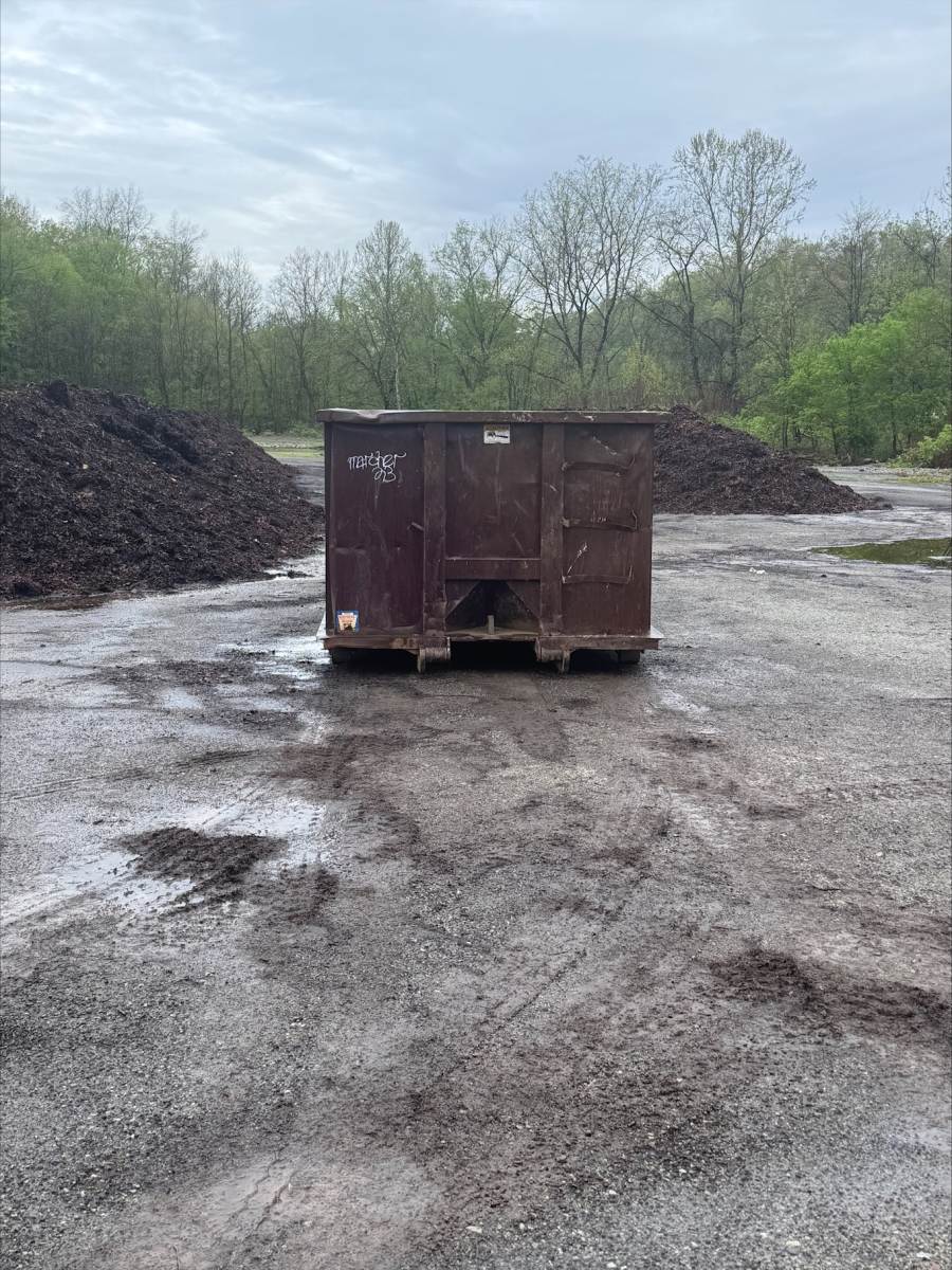 The dumpster is located in the rear of the property adjacent to the leaf compost pile.