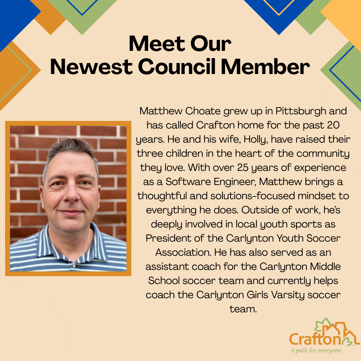 Matthew Choate grew up in Pittsburgh and has called Crafton home for the past 20 years. He and his wife, Holly, have raised their three children in the heart of the community they love. With over 25 years of experience as a Software Engineer, Matthew brings a thoughtful and solutions-focused mindset to everything he does. Outside of work, he’s deeply involved in local youth sports as President of the Carlynton Youth Soccer Association. He has also served as an assistant coach for the Carlynton Middle School soccer team and currently helps coach the Carlynton Girls Varsity soccer team.