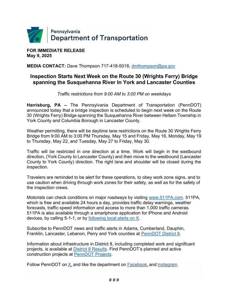 Harrisburg, PA – The Pennsylvania Department of Transportation (PennDOT) announced today that a bridge inspection is scheduled to begin next week on the Route 30 (Wrights Ferry) Bridge spanning the Susquehanna River between Hellam Township in York County and Columbia Borough in Lancaster County.